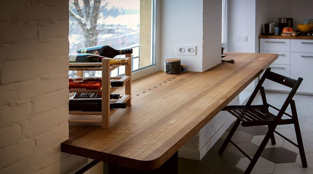 - Дополнительное рабочее пространство. Минимальная ширина конструкции должна составлять чуть больше полуметра. Хороший способ экономии пространства.