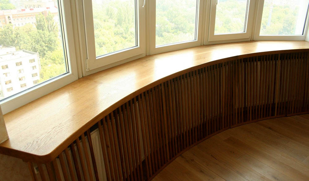 - подоконные доски расширенного типа размером от 40 сантиметров. Установка этого типа изделий представляется возможной при наличии в помещении широких опорных стен. Подобная конструкция эффективно сэкономит площадь комнаты. Кроме этого, можно привлекательно задекорировать радиатор;