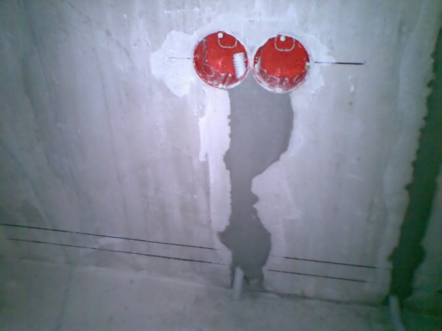 Такое описание у работ для тех, кто интересуется, как установить подрозетник в бетоне. Без проводов не обойтись: