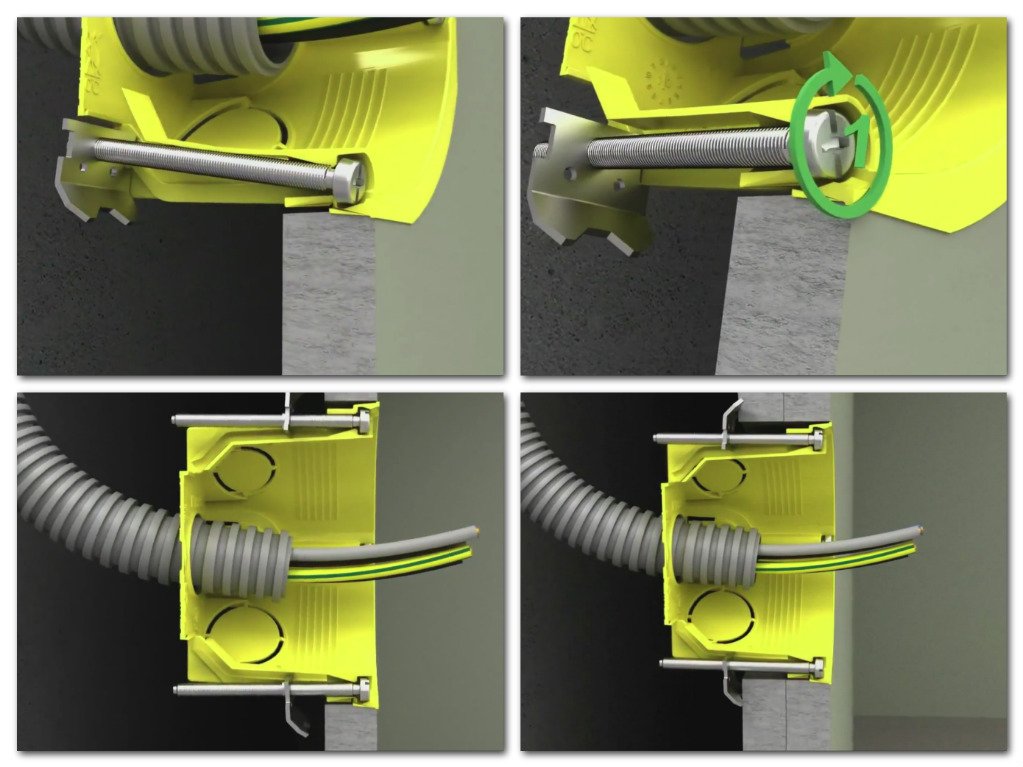 Лапа начинает движение после того, как поворачиваются винты. Всё это делается для качественного закрепления. На задней части находятся особые отверстия, которые заготовлены под провода. Вырежьте место для установки кабеля. Провод должен зайти с задней стороны. Есть множество фото подрозетников, где показано всё поэтапно.