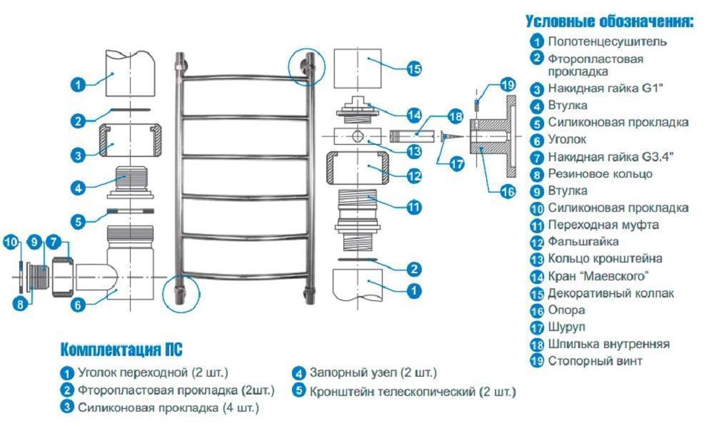 2. Схема подключения полотенцесушителя к ГВС требует приобретения дополнительных соединительных фитингов, для чего берется в расчет способ крепления на полотенцесушителе и водопроводной магистрали: