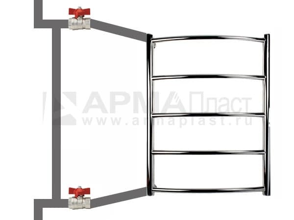 2. Параллельное подключение. при котором создаются ответвления в магистрали горячего водоснабжения для подключения полотенцесушителя, а между врезками устанавливается кран, регулирующий прохождение потока горячей воды через отопительное устройство. Такая схема подключения полотенцесушителя к ГВС нередкая, ведь она актуальна при очень высоких или низких температурах воды в магистрали, чтоб оставалась возможность регулировки тепловых режимов воды из крана и обогрева.