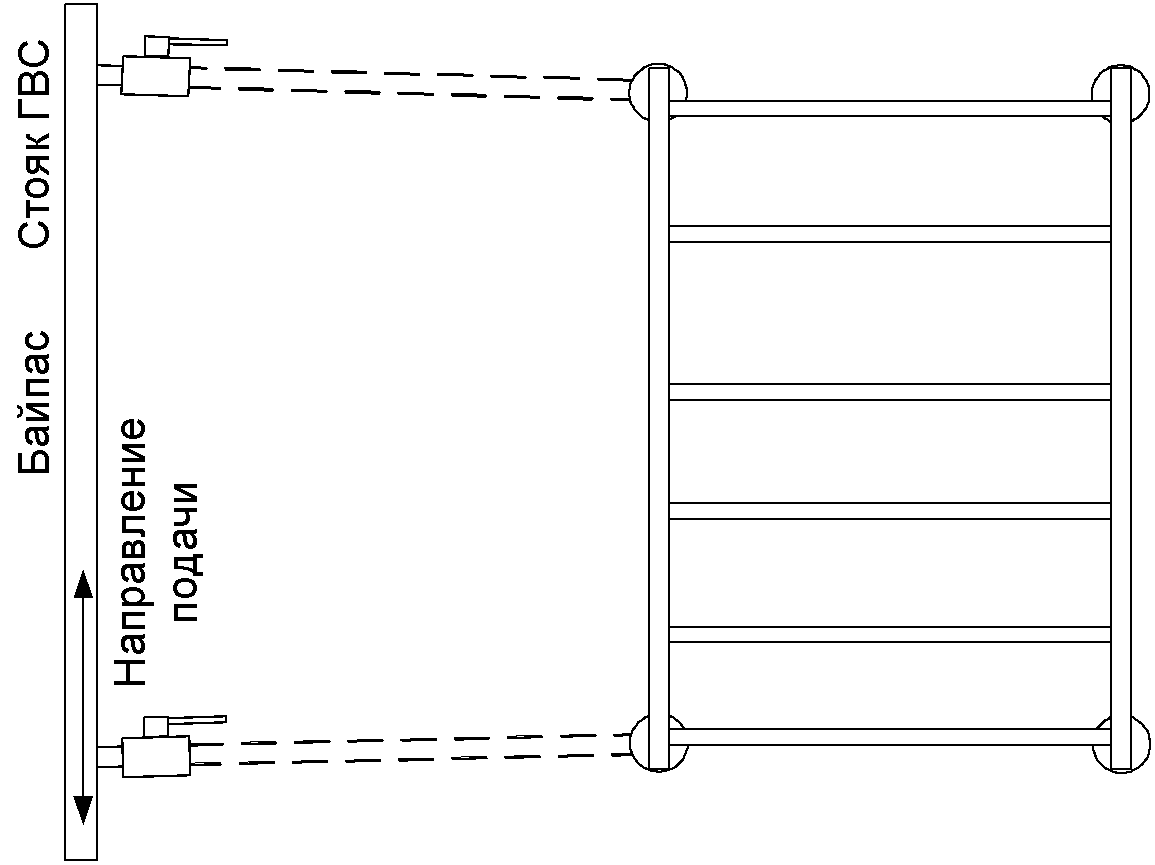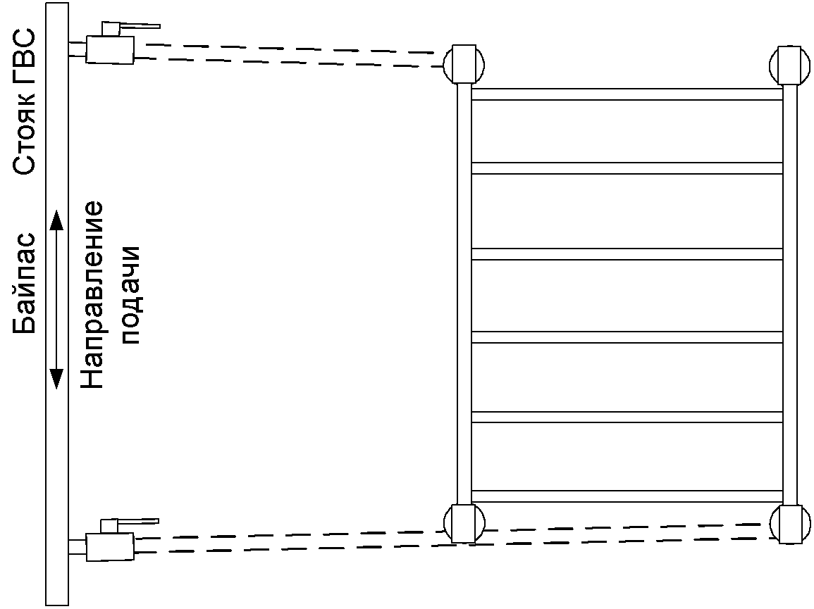 Схемы бокового и диагонального подключения полотенцесушителя-«лестницы» с зауженным байпасом на стояке