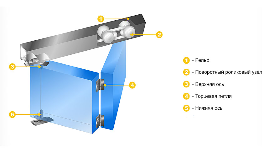 Полотно складной двери-книжка имеет вид двух створок, которые соединяются петлями. Первая створка крепится на осевые петли, а вторая ездит на ролике. При открывании одна створка поворачивается по оси и тянет за собой вторую.
