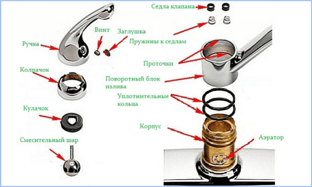 При выходе из строя ремонт однорычажного смесителя в большинстве ситуаций состоит в простой смене унифицированного блока переключения или его деталей.