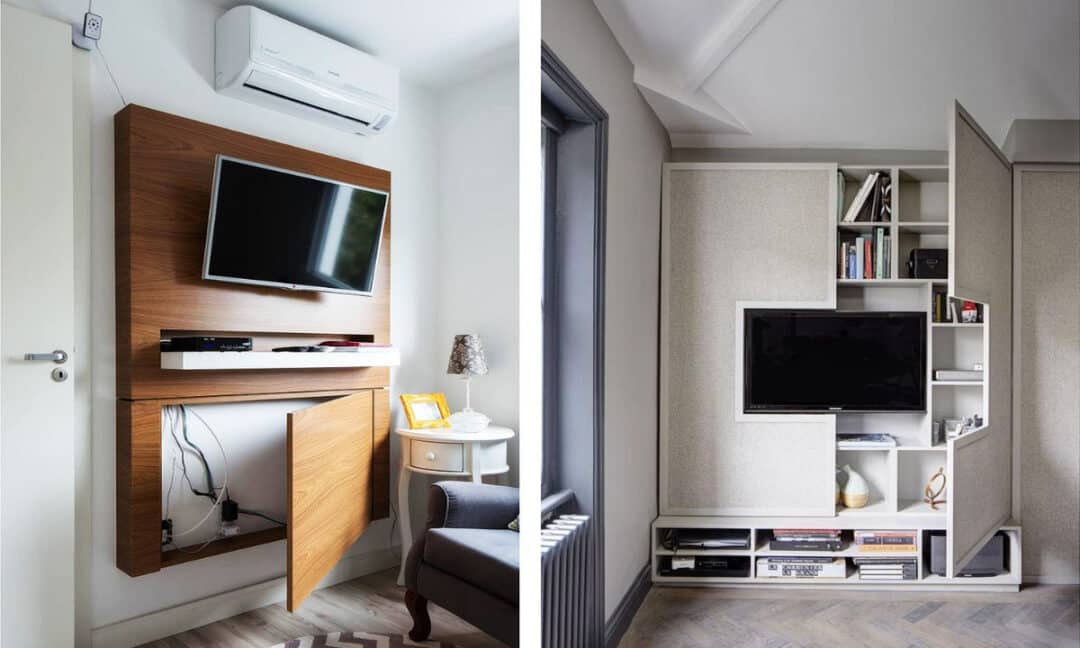 Без особых сложностей провода от телевизора можно спрятать в мебель. Это могут быть тумбы под технику с отверстиями под коммуникации или стенные гарнитуры со нишами. К тому же найти мебель, которая удачно впишется в оформление комнаты вполне возможно.