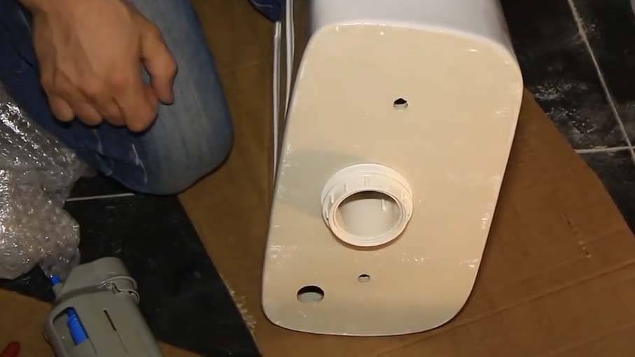 Стандартный унитазный бачок обычно имеет четыре основные отверстия. Самая крупная выемка предназначена для установки клапана слива. Перед соединением этих двух конструкций обязательно нужно позаботиться, что бы на самом клапане была самая широкая и толстая прокладка. После этого, на внешнюю сторону бачка устанавливают пластиковую шайбу и закручивают гайку.