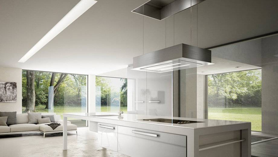 Потолочные вытяжки предназначены для кухонь с печкой, установленной посреди помещения. Такие устройства встречаются в основном в престижных жилищах с повышенными условиями комфорта. Монтаж островных моделей осуществляется работниками специализированных фирм.