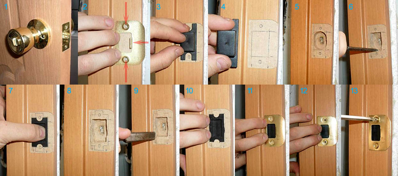 Теперь измеряем толщину накладки, стамеской убирая лишние части до тех пор, пока планка будет иметь возможность четко зайти в полотно двери. По схеме вставляем защелку, прикручиваем ее двумя шурупами, находящимися в том же комплекте, где и ручки.