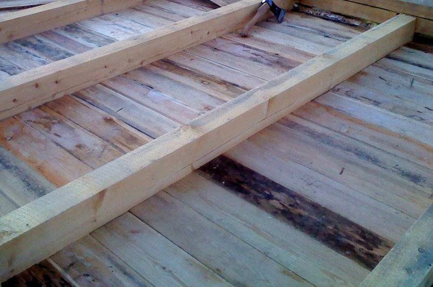 Перед укладкой проверяют надежность крепления элементов старого напольного покрытия, дублируют не внушающий доверия крепеж, при необходимости демонтируют изношенные доски, вместо которых можно уложить недорогие пиломатериалы из сосны.
