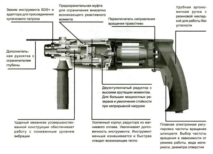 В основе конструкции любого перфоратора лежит поршневой ударный механизм, активируемый каким-либо приводом: электрическим, гидравлическим или пневматическим.