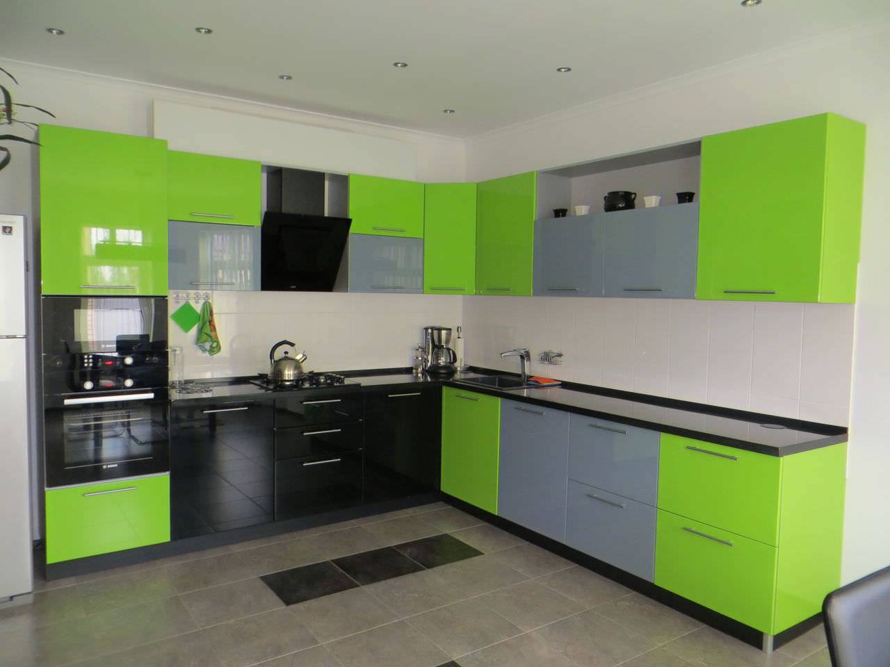 В кухнях стиля модерн допускаются цветные фасады. Здесь доминируют яркие красные, сочные зеленые, оранжевые, желтые тона. В дополнение к ним выбирают нейтральный белый или серый, а также оттенки на тон темнее или светлее базового.