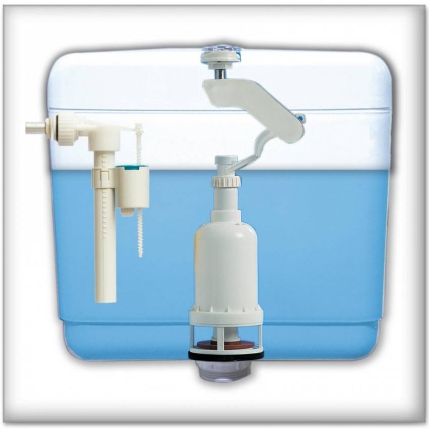 Работает механизм так же, как и в старых системах, поэтому, когда поплавок опущен, то клапан открыт и вода поступает в бачок. Когда вода в бачке достигла определенного уровня, то поплавок поднимается и блокирует клапан, после чего вода уже не может поступать в бачок. Система слива воды так же работает по той же схеме, поскольку клапан открывается при нажатии на рычаг. Система перелива воды функционирует аналогичным образом, но трубка выведена в то же отверстие для слива воды.