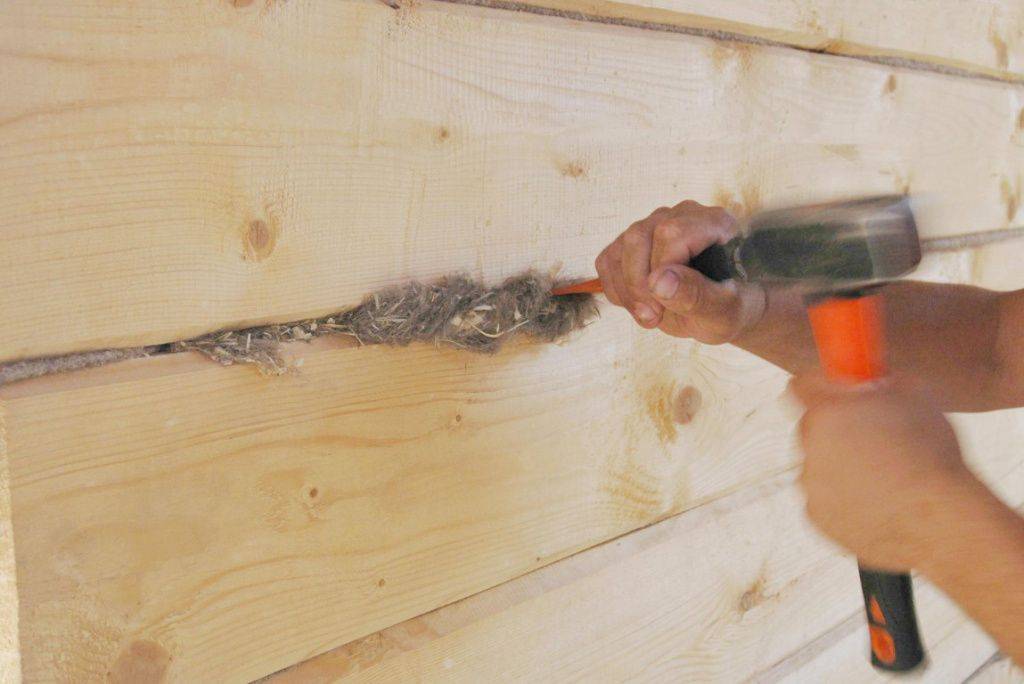 Перед утеплением сруба, необходимо тщательно проконопатить стены мхом или джутом. Данные материалы способны быстро отдавать в окружающую среду всю накопленную влагу. Производить все работы следует только в сухую и теплую погоду. Межвенцовый утеплитель проталкивается между бревнами специальной лопаткой и трамбуется до тех пор, пока материал заходит. Бревна можно дополнительно обработать антисептиком.