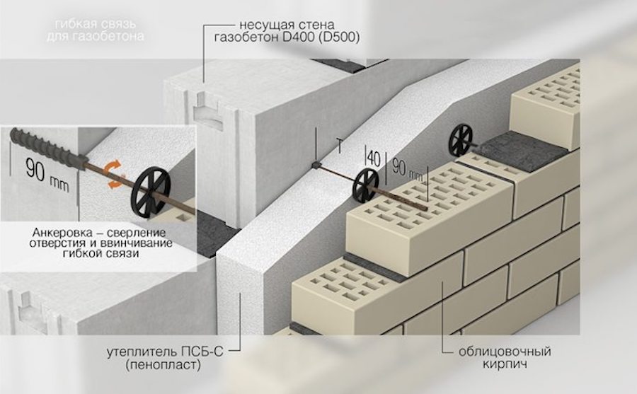В устройстве слоистой кладки технология, как это часто бывает, имеет принципиальное значение. При фиксации теплоизоляции исключены мокрые процессы, крепление производится механическим способом при помощи специальных гибких связей.