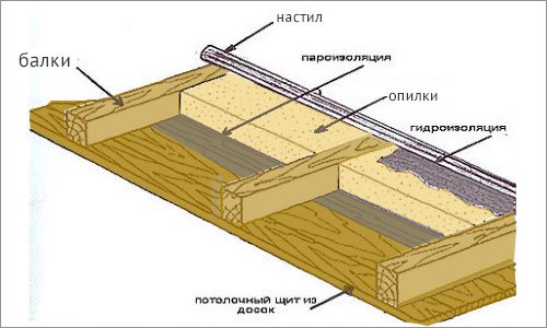 Важно защитить изолятор от воды, для этого на перекрытия кладут слой пароизоляции, проклеивая швы соединений скотчем либо битумом. Затем на пароизоляцию сыплют опилки слоем 20-30 см