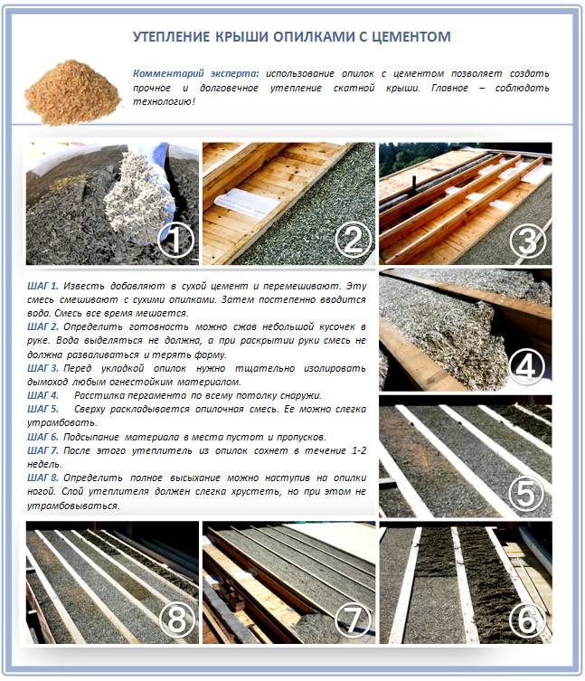 Качество выполненной работы во многом будет зависеть от правильности выбора этого утеплителя. Необходимо использовать слегка влажный или полностью сухой древесно-стружечный материал, который не имеет плесени и посторонних запахов. Рекомендуется предварительно обработать опилки антисептиками и антипиренами.
