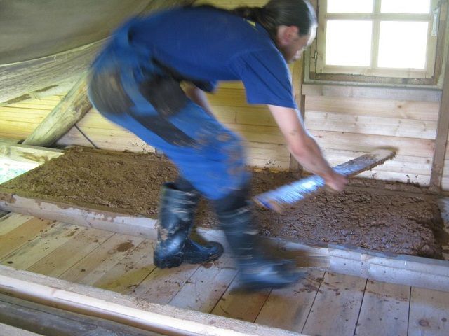 Жирная глина надежно скрепляет раствор. Многое зависит и от ее правильного замачивания. Для пола вода с глиной берутся в равных объемных количествах. Глину заливают, через сутки ее перемешивают до состояния сметаны. В густую смесь при этом добавляют воду, в жидкую – сухую глину. Затем готовая замоченная глина смешивается с опилом: для дальнейшей штукатурки примерная пропорция 1:2/3, для утепления пола – 1:1.