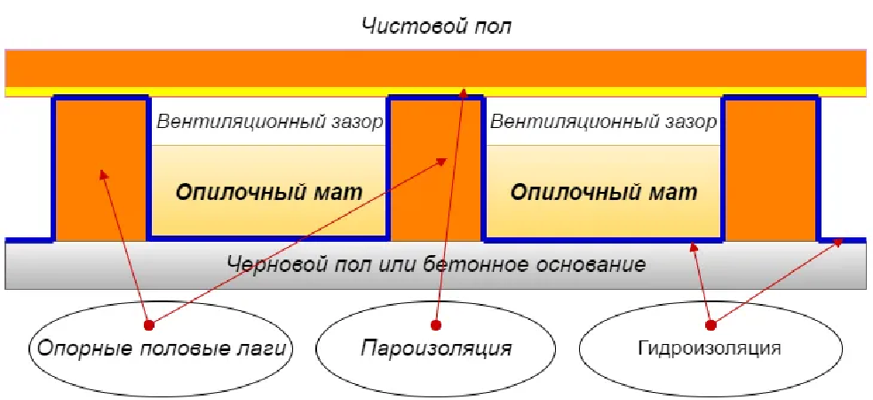 Утепление пола начинается с настила гидроизоляционного материала сплошным слоем с огибанием лаг. От верхнего слоя засыпанного или уложенного утеплителя до чистового пола оставляют вентиляционный зазор в 2-3 см. Дозированный контакт опилок с парами влаги из воздуха обеспечивается настилом пароизоляционной мембраны, на которую уже настилают чистовое покрытие пола.