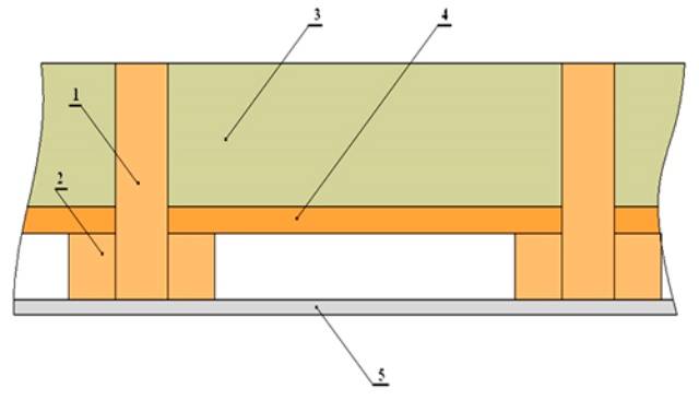 Цифрами обозначены следующие части конструкции: 1 – несущая балка, 2 – брусок, называемый «черепным» и служащий основанием для черновых поверхностей, 3 – слой теплоизолятора, 4 – черновой потолок, 5 – внешний декор. Изучив строение этой конструктивной составляющей дома, можно переходить к монтажным и отделочным операциям.