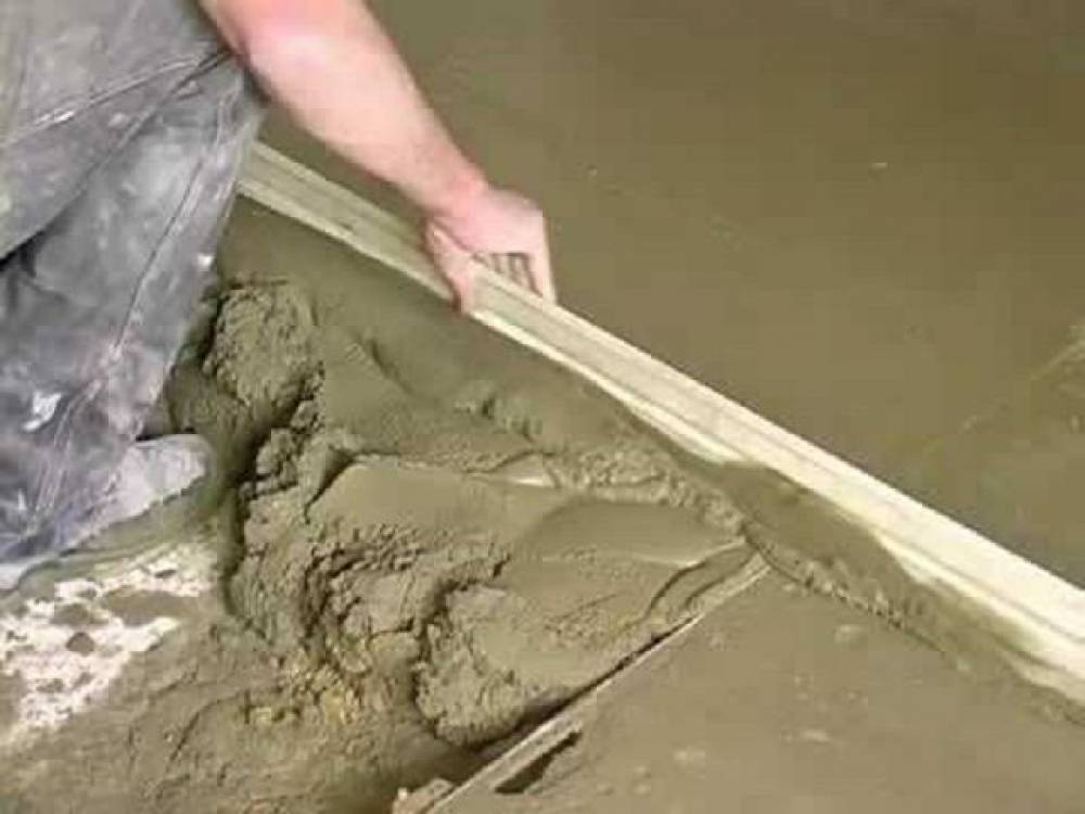- Заливается приготовленный раствор и зигзагообразными движениями разравнивается по маякам правилом.