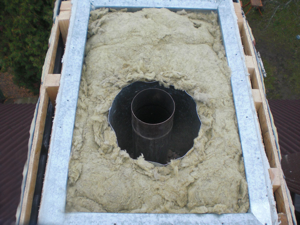 Скатная кровля требует устройства деревянной системы стропил, которая, как становится понятно, имеет максимальную степень горения. Именно поэтому оборудовать все зазоры между трубой и элементами из дерева нужно в соответствии со строительными нормами и правилами (СНиП). Чтобы не допустить соприкосновения нагретой трубы с горючими материалами, следует применять специальную конструкцию. Обычно для этого в необходимом месте монтируется проходной узел в форме прямоугольника. По внешнему виду он напоминает короб, наполненный стекловатой или любым другим материалом, являющимся негорючим.