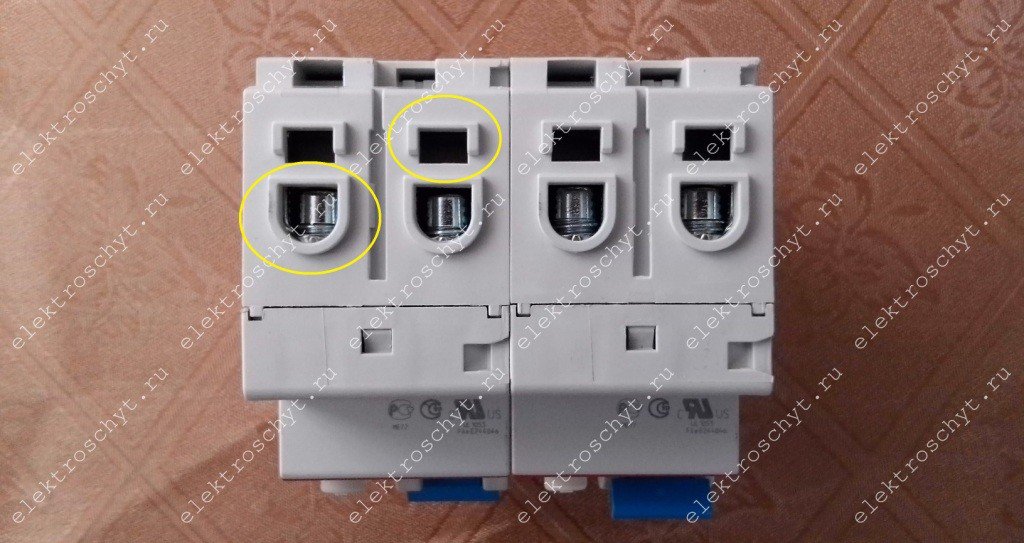 Также, как у выключателей ABB S200, есть по два контакта на каждом полюсе сверху и снизу.