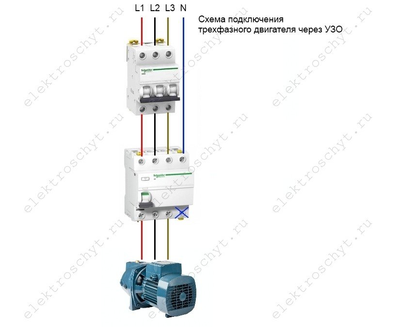 Собственно ничего сложного в этом нет, для корректной работы трехфазного УЗО нулевой проводник мы подключаем на нулевую клемму УЗО со стороны питания, а со стороны двигателя она остается пустая.