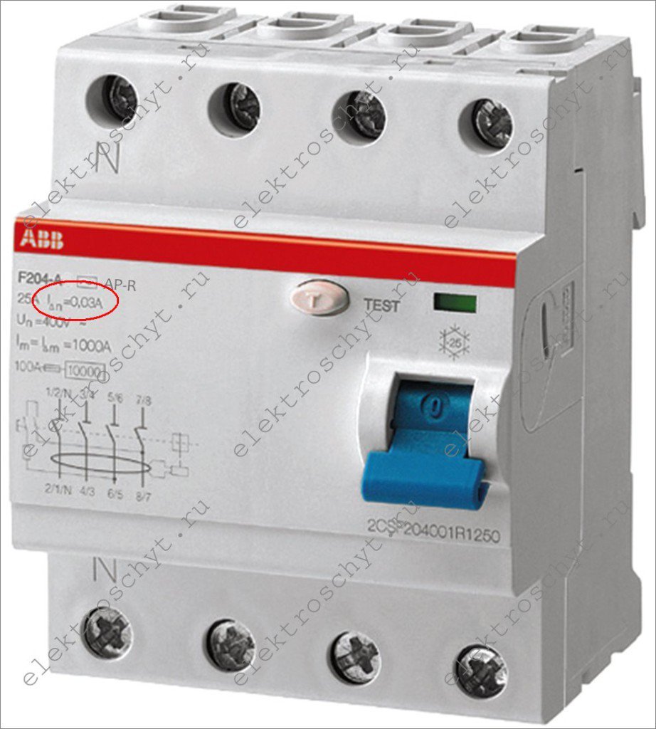Номинальный отключающий ток УЗО I∆n или ток утечки также указывается на лицевой панели УЗО.