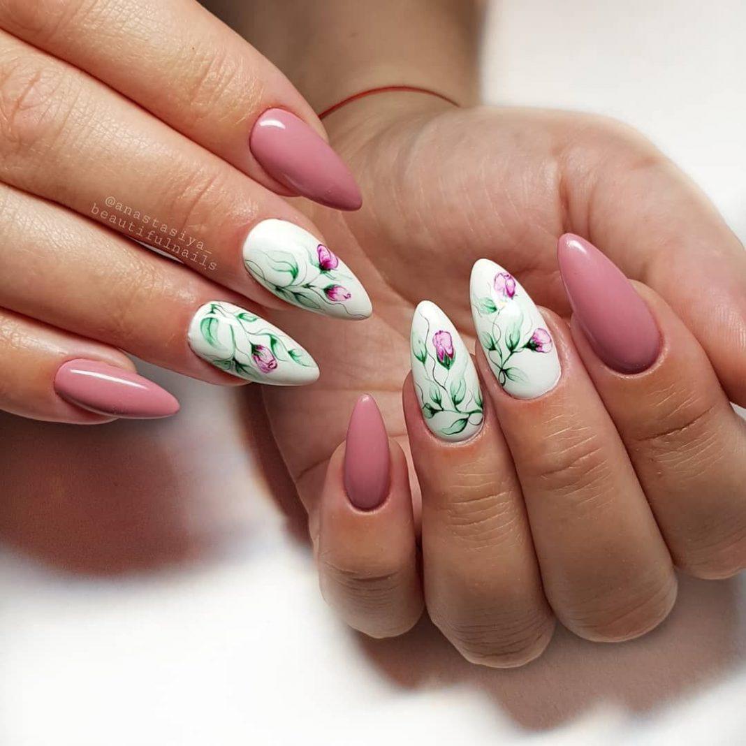 Великолепно смотрятся полевые цветы, чайные розы, рисунки с бабочками и другими насекомыми. Присмотритесь к нейл-артам с белоснежными ромашками и весенними тюльпанами. Розы в весеннем маникюре встречаются редко, они уместнее смотрятся в осеннем нейл-арте в бордовом цвете.