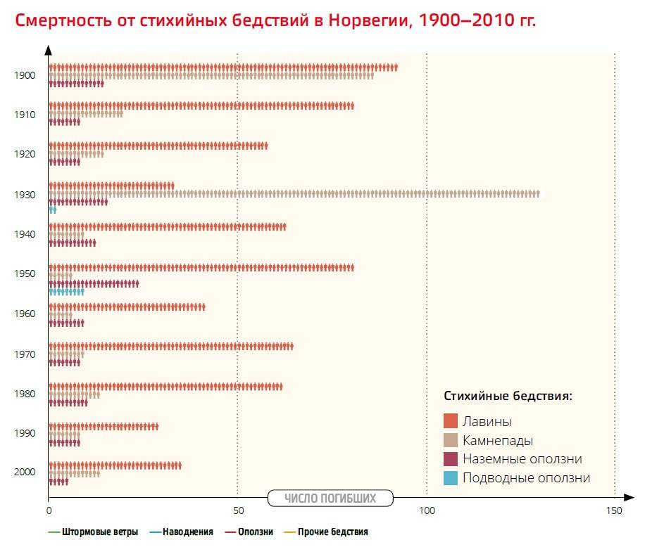 Исключительные географические и климатические условия Норвегии определяют характер основных природных рисков на ее территории. Среди стихийных бедствий лидируют оползни и снежные лавины. За последние 150 лет от схождения оползней и камнепадов погибло более двух тысяч человек, что является достаточно высоким показателем для малонаселенной страны.