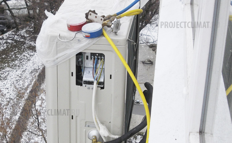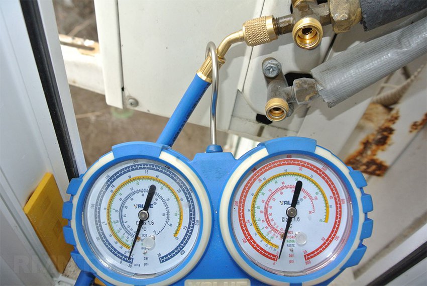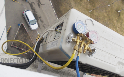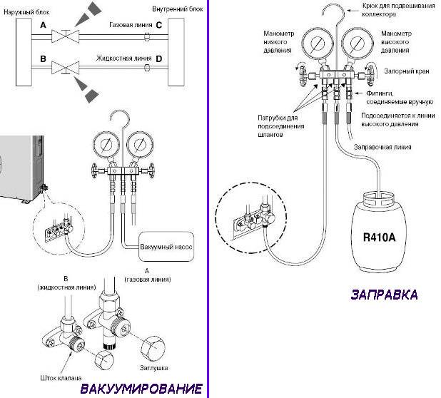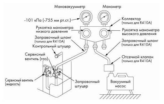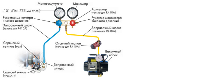 Коллектор и манометры подсоединяются к сервисным портам наружного модуля с помощью шлангов. Третий шланг коммутирует внешний кран кондиционера и вакуумный насос. Помпа включается.