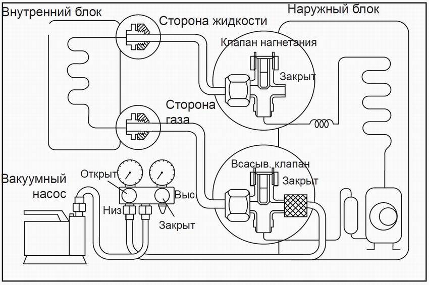 Работы по вакуумированию и герметизации кондиционера перед заправкой системы хладагентом из баллона выполняют в следующем порядке: