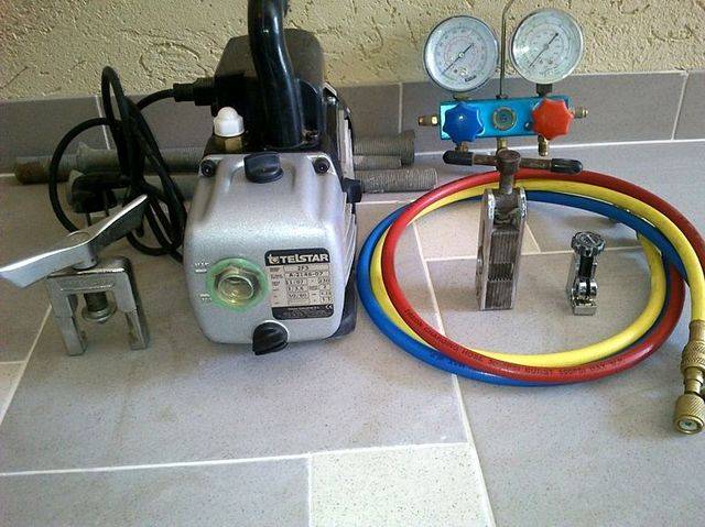 Поскольку вопрос о том, зачем вакуумировать кондиционер, уже рассмотрен, можно перейти к другому — не зачем, а чем это делать. Для герметизации компрессорно-конденсаторного блока используют вакуумные насосы, которые называют вакууматорами. Чтобы откачивать воздух из трассы, подойдет оборудование двух основных видов: как низковакуумное (0,1 мбар), так и высоковакуумное (0,02 мбар).