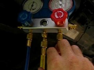 - При помощи комплекта из двух шлангов к сервисным штуцерам внешнего блока климатической системы подключают коллектор с манометром.