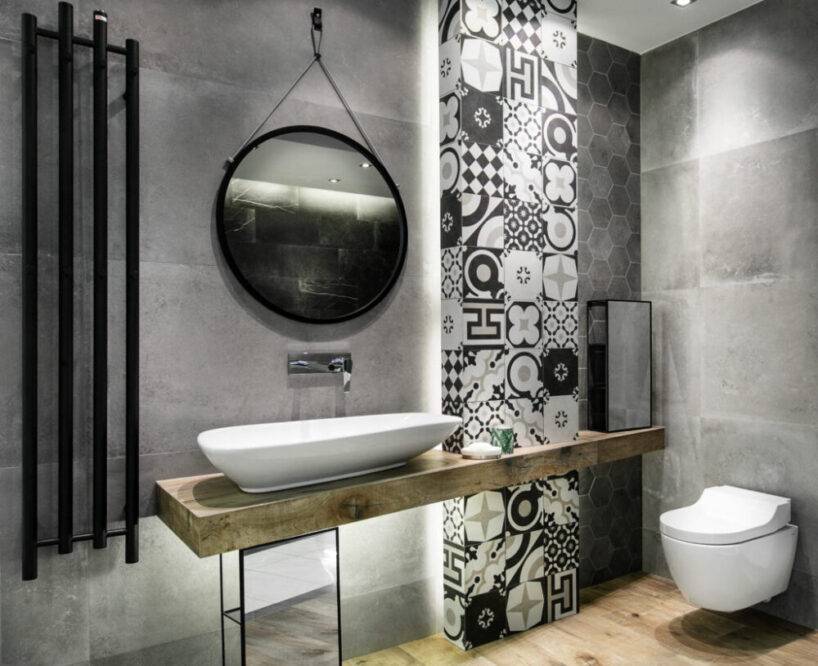 Серая ванная комната в сочетании с деревом.