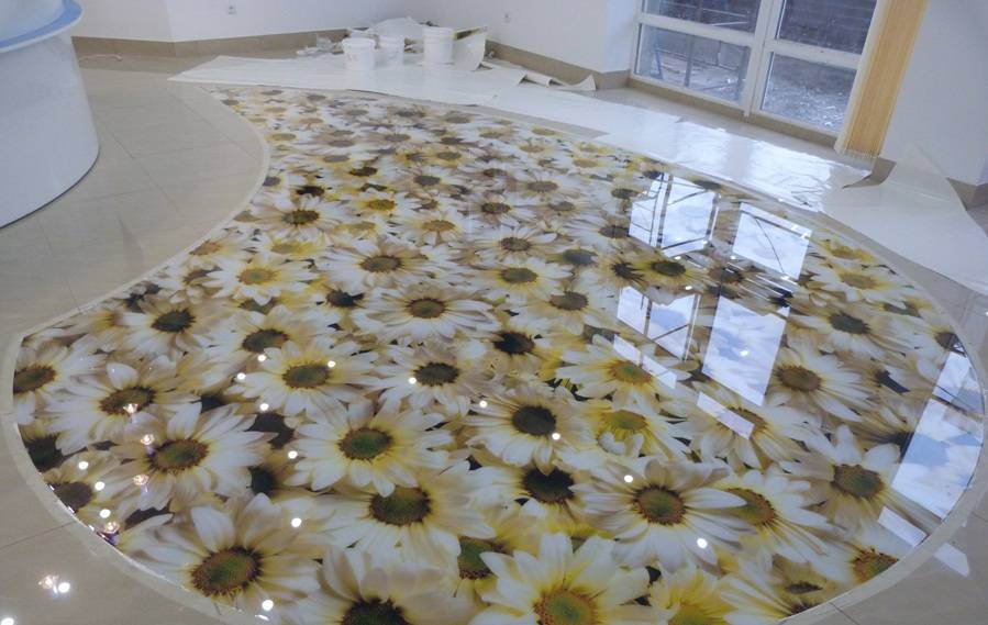 Такой вариант отделки можно назвать самым ярким и оригинальным. При этом наливные полы имеют длительный срок службы, они устойчивы к износу, разнообразным жидкостям, включая едкие вещества. А про выбор цветов и рисунков и говорить не стоит, тут все зависит от фантазии заказчика.