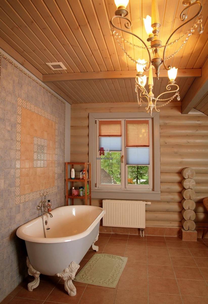 Облицовка стен ванной комнаты чаще всего проводится с использованием плитки. При этом стены могут облицовываться плиткой либо полностью, либо частично. Во втором случае покрываются места, которые наиболее подвержены воздействию воды. Остальная площадь стен остается деревянной, что сохраняет определенный шарм деревянного строения, позволяя вдыхать целебный воздух разогретой природы. Дерево обладает магическим свойством дарить жизненную энергию, которую излучают теплые стены ванной комнаты. Дизайн интерьера может подразумевать отделку деревянных стен другими материалами.