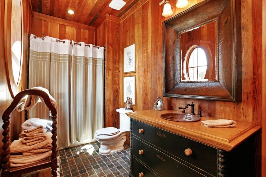 Дизайн интерьера санитарного узла ограничивается только фантазией человека, строящего деревянный дом. Облицовка стен, сантехника может быть любая. Главное — соответствие требованиям водостойкости, а также санитарным нормам. Для этого вертикальные поверхности обрабатываются специальными антисептическими составами, которые эффективно защищают дерево от плесени, грибка и гниения. Душевая кабина или большая ванна типа джакузи — выбор интерьера принадлежит исключительно хозяину в соответствии с его возможностями.