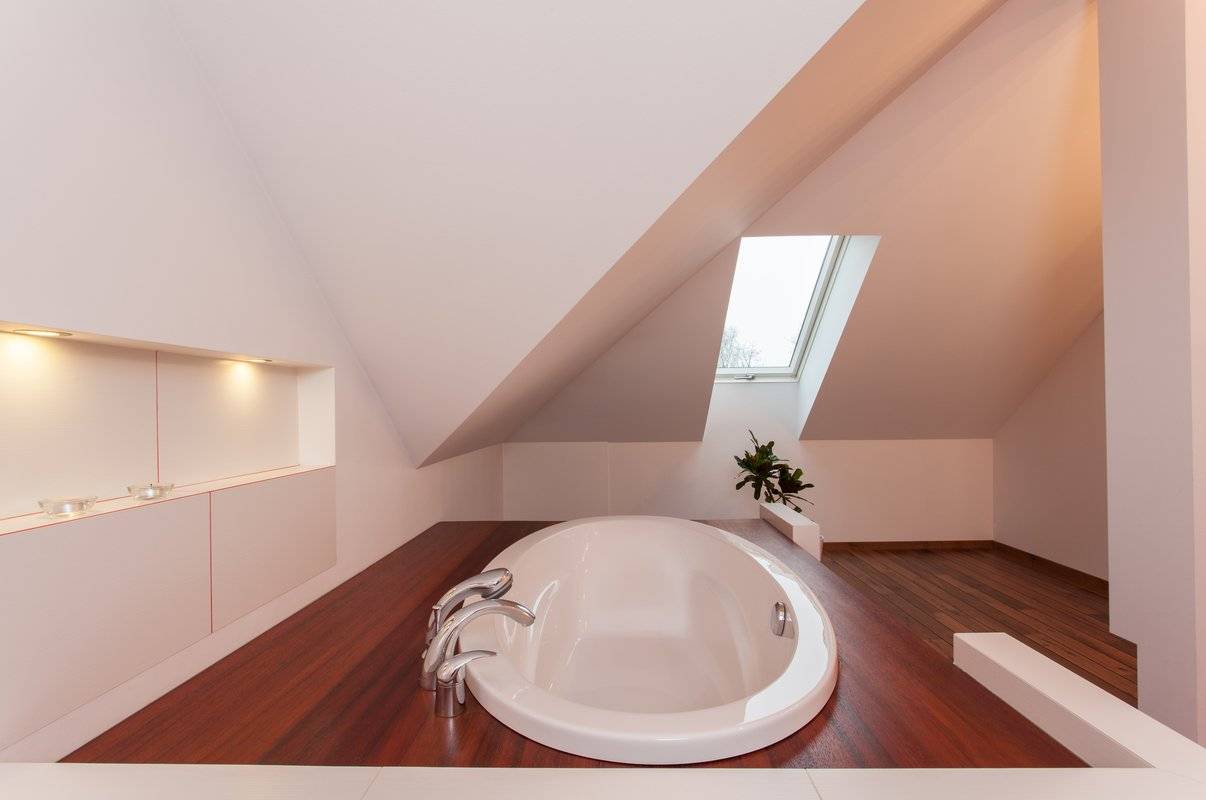 Ванну на мансарде можно устроить даже при многоскатной крыше
