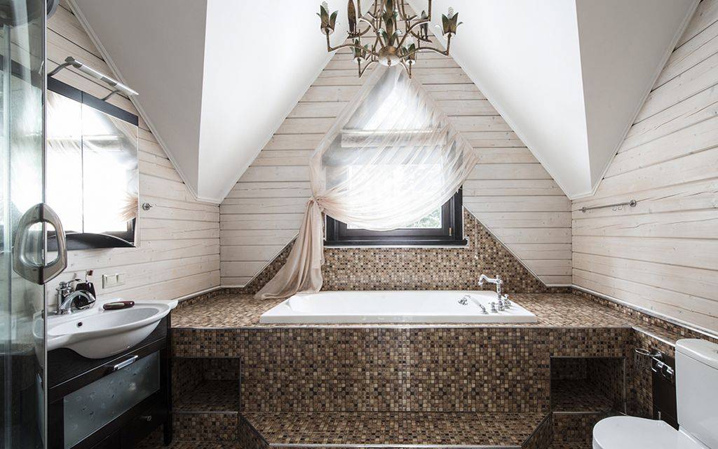 Дизайн ванны подчиняется форме крыши, поэтому логично использовать пространство полностью:
