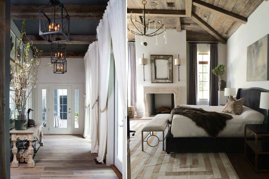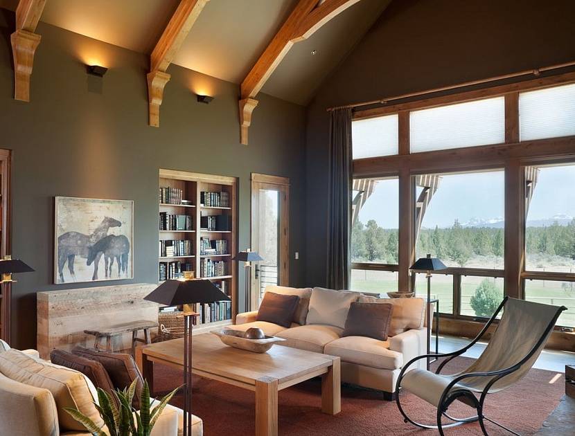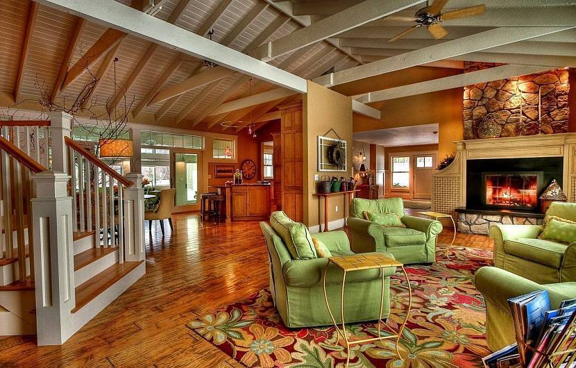 Зато потолок, который в классическом варианте должен быть гладким, в стиле кантри может быть украшен тёмными деревянными балками.