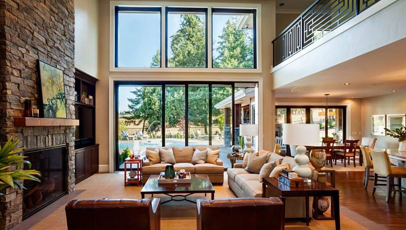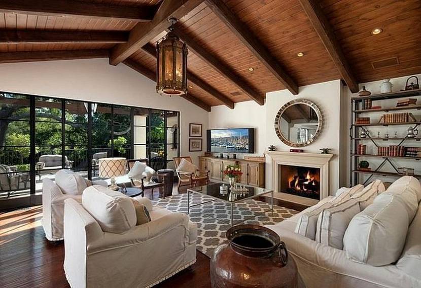Для отделки потолков современный американский интерьер предусматривает следующие виды оформления: