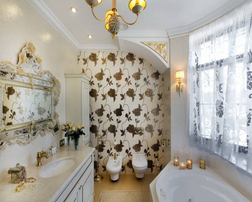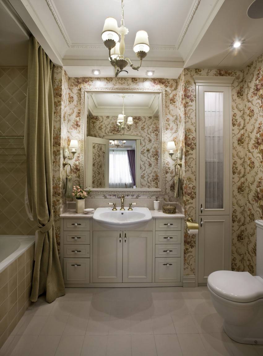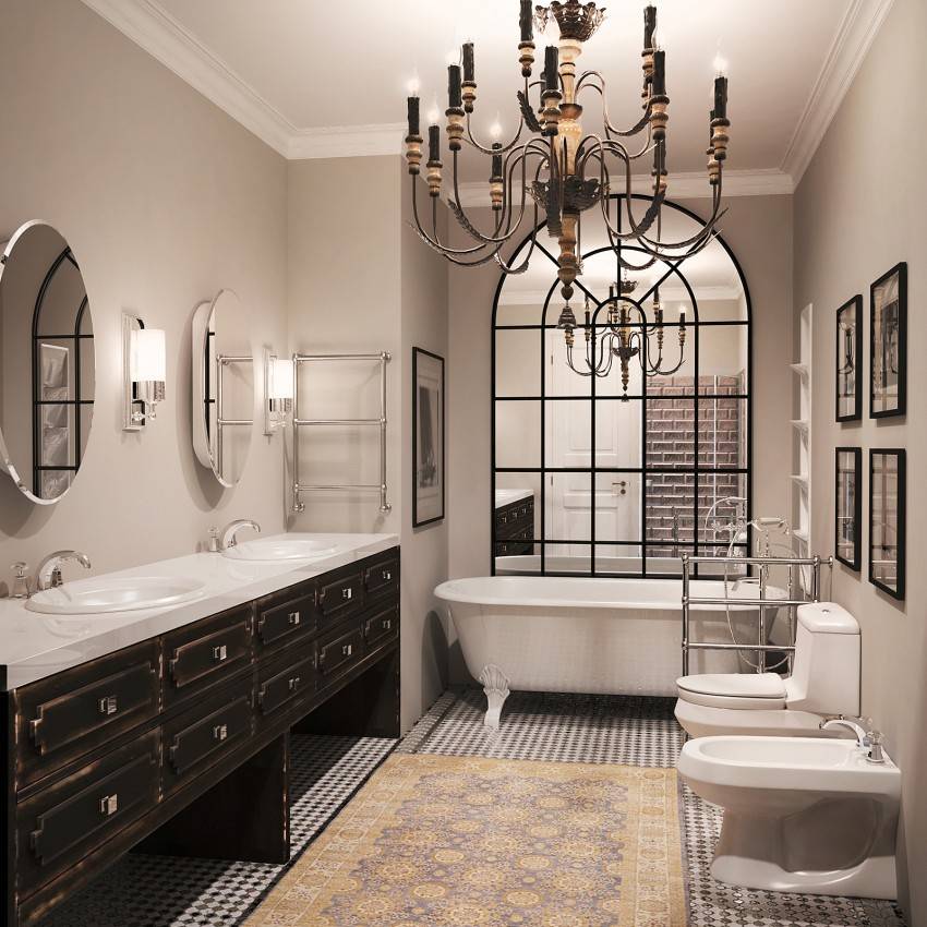 Акцент делается на медных люстрах, допускаются светильники в латунных оправах и с хрустальными подвесками. Для визуального разделения на зоны предусматриваются настенные бра по обе стороны зеркала, расположенного над раковиной.