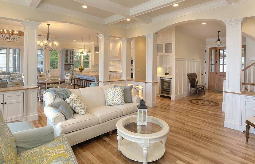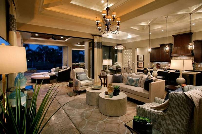 При оформлении просторного помещения нельзя забывать про хорошее освещение: при оформлении потолка можно использовать различные варианты осветительных приборов (от массивных люстр до миниатюрных встроенных светильников).