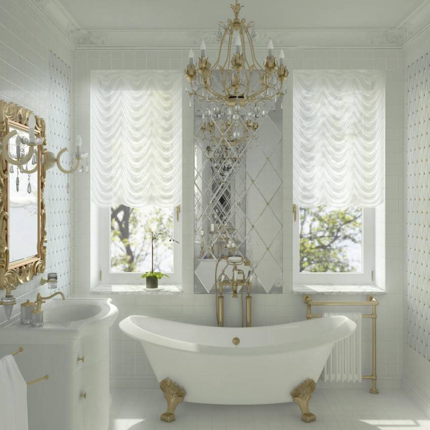 Также важный декор – шторы. Можете использовать как тяжелые портьеры из дорогих тканей, так и прозрачные тюлевые занавески – в зависимости от площади вашего ванного пространства.