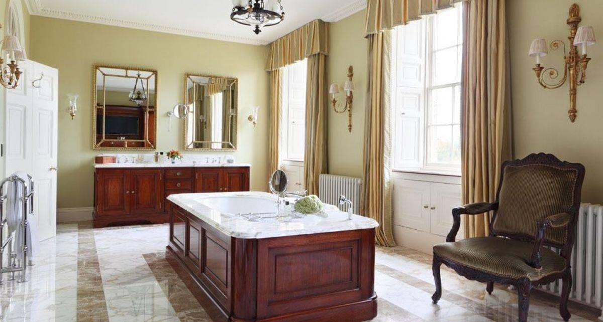 Особенностью просторной ванной в английском стиле является присутствие предметов мебели, которые обычно не характерны для помещения такого профиля.