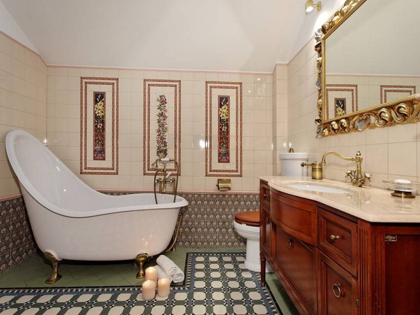 - ванна должна быть на ножках, напоминающих лапы животных, а разводка труб и краны – медные;
