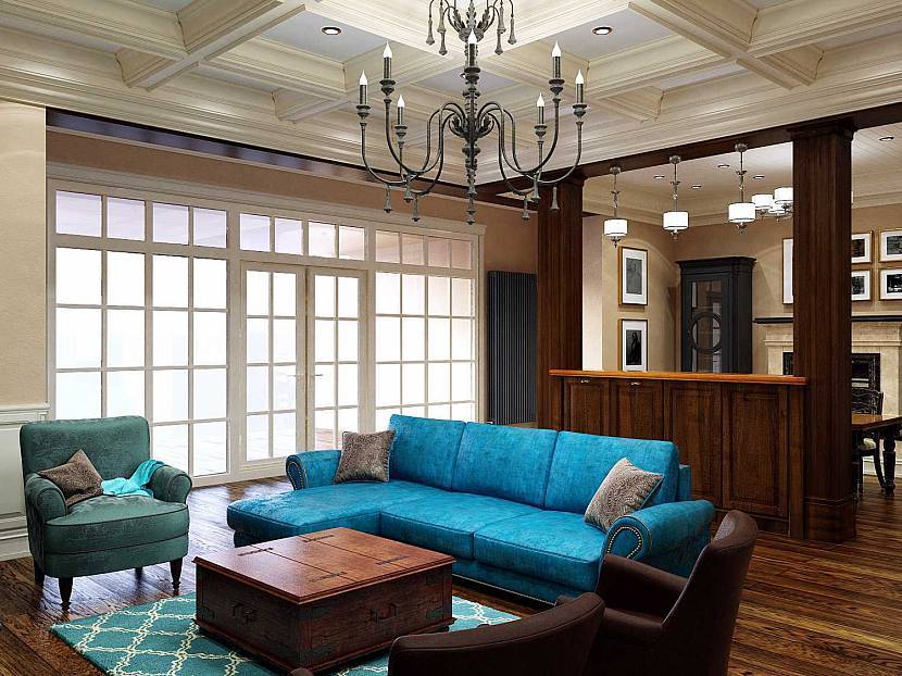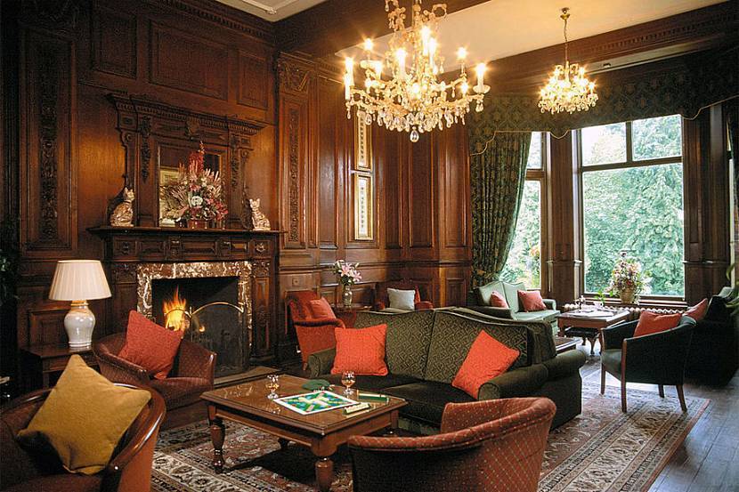 Максимальное использование натуральных материаловсоздает эксклюзивность композиции. Дорогие сорта древесины бука, дуба, красного и черного дерева применяются для отделки стен и пола. Старинная деревянная сложной конструкции мебель на причудливо изогнутых ножках и тяжелые трехслойные шторы из далеко не дешевого текстиля украшают просторное помещение. Дух консерватизма и преданности традициям привносит камин из натурального камня с коваными решетками, кочережками и щипцами.