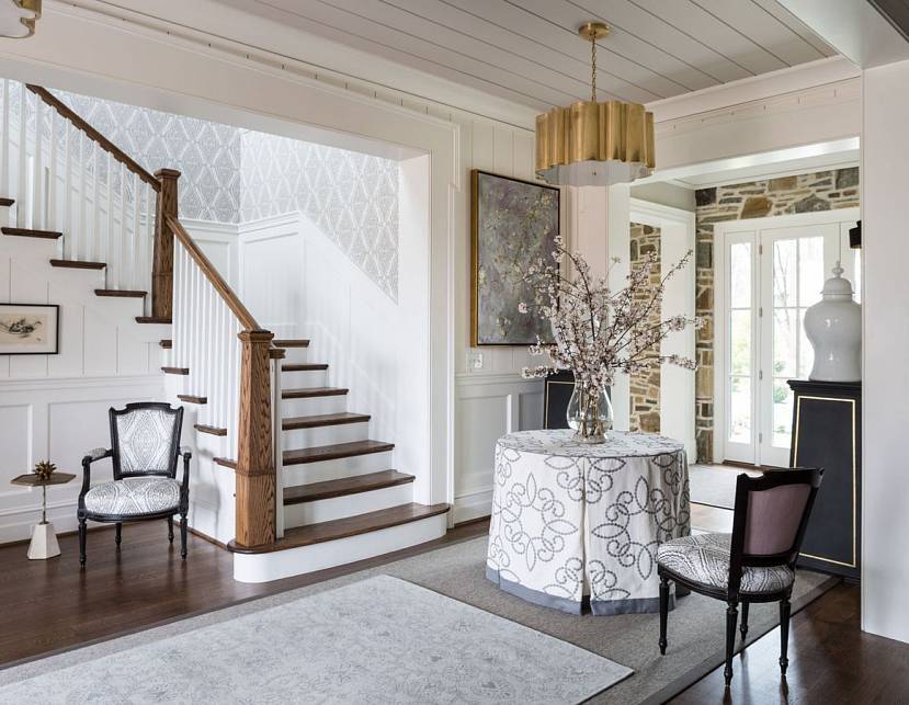Другими способами отделки стало использование вставок из дерева или камня, а также оклеивание обоями с мелким узором. Не рекомендуется выбирать обои с большими принтами, поскольку они нарушат ненавязчивую атмосферу этого стиля.